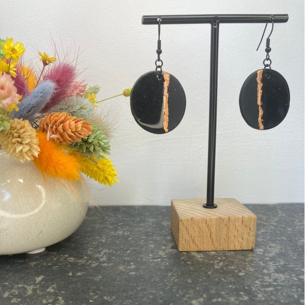 Deze zwarte oorbellen met een koperen lijn brengen een perfecte balans tussen kracht en subtiliteit. Ideaal voor een chique uitstraling!