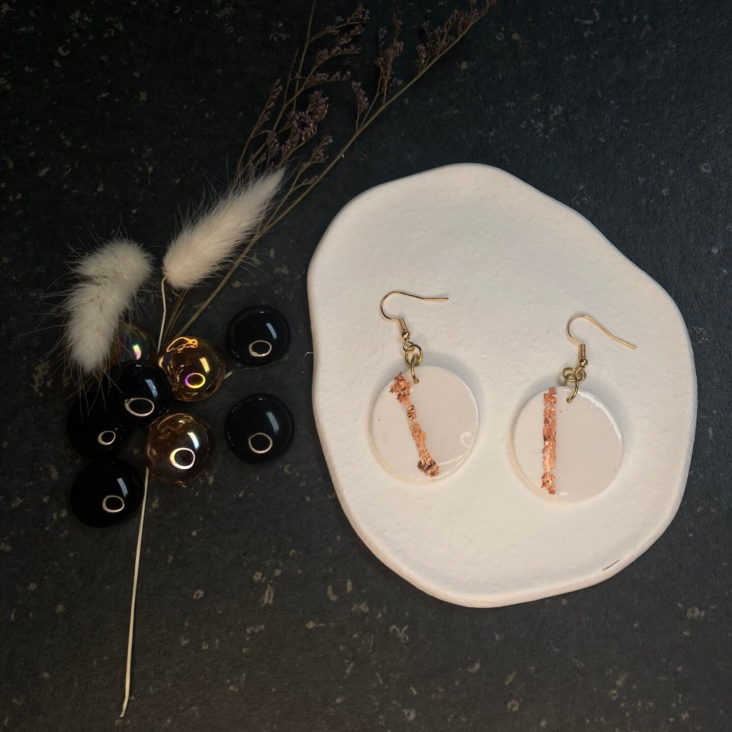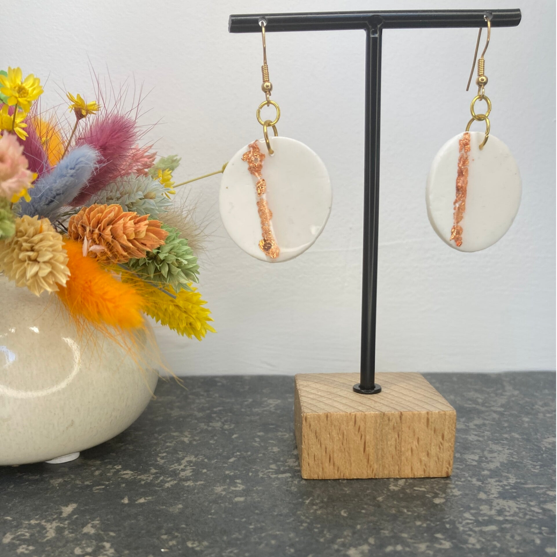 Fris en stijlvol: deze witte oorbellen met een subtiele koperen lijn zijn de perfecte finishing touch voor elke look.