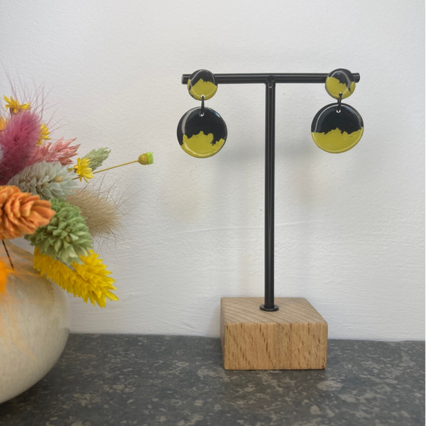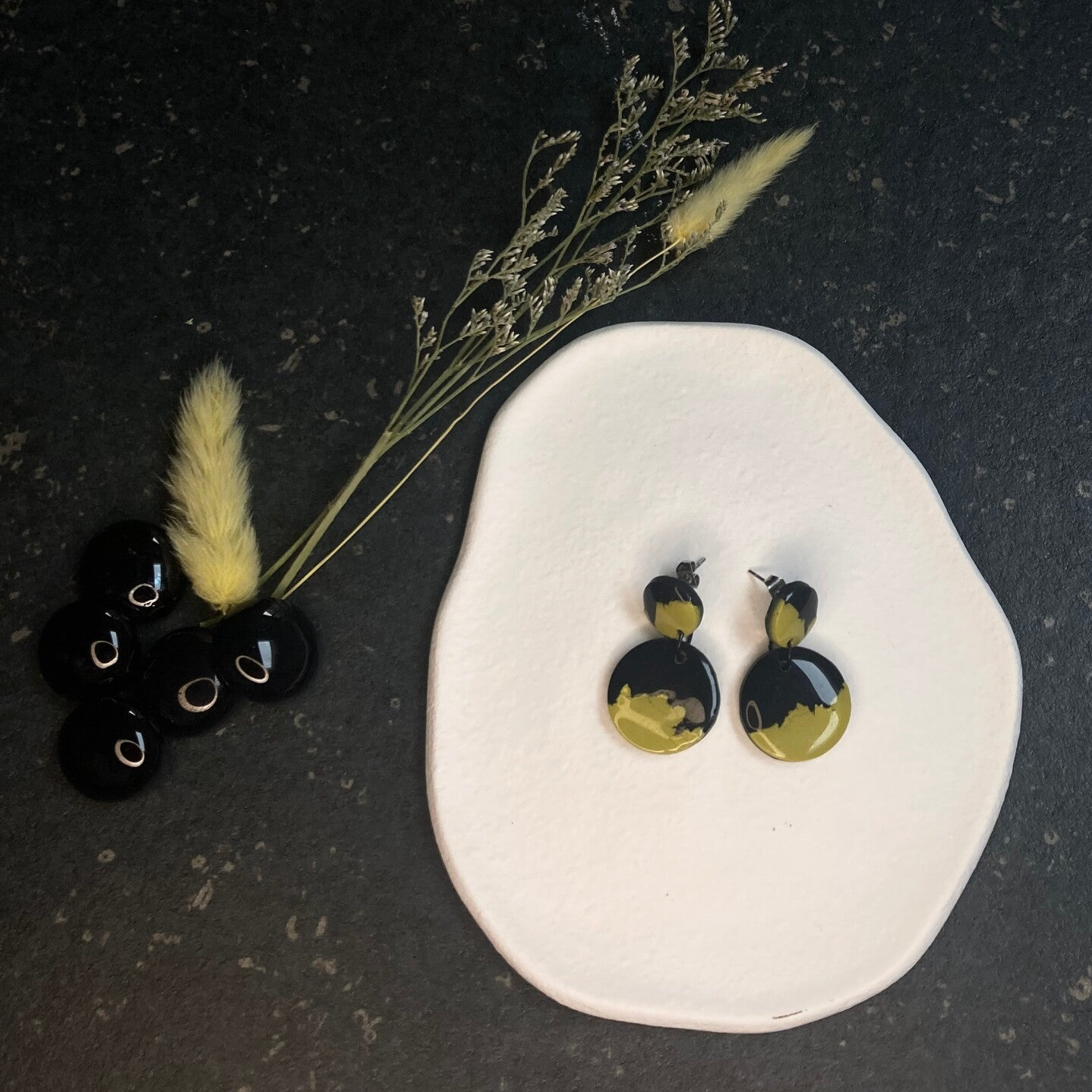 Deze zwarte oorbellen met olijfgroene gekartelde details zijn een gedurfde en unieke keuze voor je look. Het speelse kartelontwerp in combinatie met de diepe zwart-groene tint zorgt voor een opvallende, maar verfijnde uitstraling.