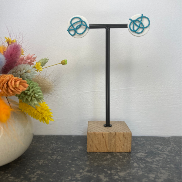 Laat je stijl stralen met deze witte ronde oorbellen, prachtig gedetailleerd met onregelmatige turquoise lijnen. Het subtiele ontwerp combineert een tijdloze ronde vorm met een eigentijdse flair dankzij de speelse turquoise accenten. Perfect voor een frisse, verfijnde uitstraling die zowel dagelijks als bij speciale gelegenheden opvalt. Deze oorbellen brengen een vleugje levendigheid en creativiteit in je look, terwijl ze een gevoel van balans en elegantie behouden. Voeg deze unieke, handgemaakte oorbellen toe aan je collectie en laat de turquoise lijnen je persoonlijkheid tot leven brengen!