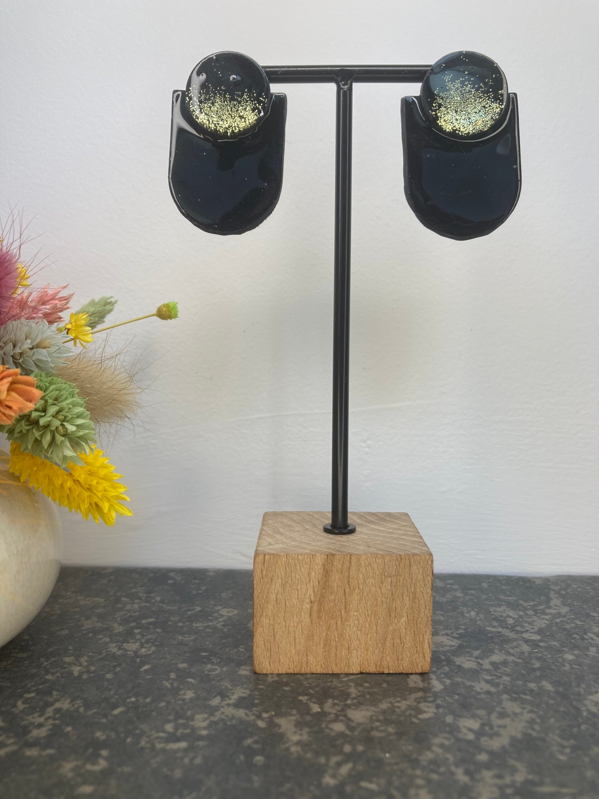 Maak een statement met deze zwarte afgeronde oorbellen, verfraaid met subtiele gouden glinsters die je look een luxe en verfijnde uitstraling geven. Het strakke, moderne ontwerp wordt perfect gecombineerd met de speelse gouden accenten, die een vleugje glamour toevoegen zonder te overdrijven. Of je nu een chique avond uit hebt of je dagelijkse stijl wilt upgraden, deze oorbellen zijn de ideale keuze. Ze brengen een verfijnde balans tussen elegantie en een beetje sprankeling, zodat je altijd de show steelt, waar je ook bent!