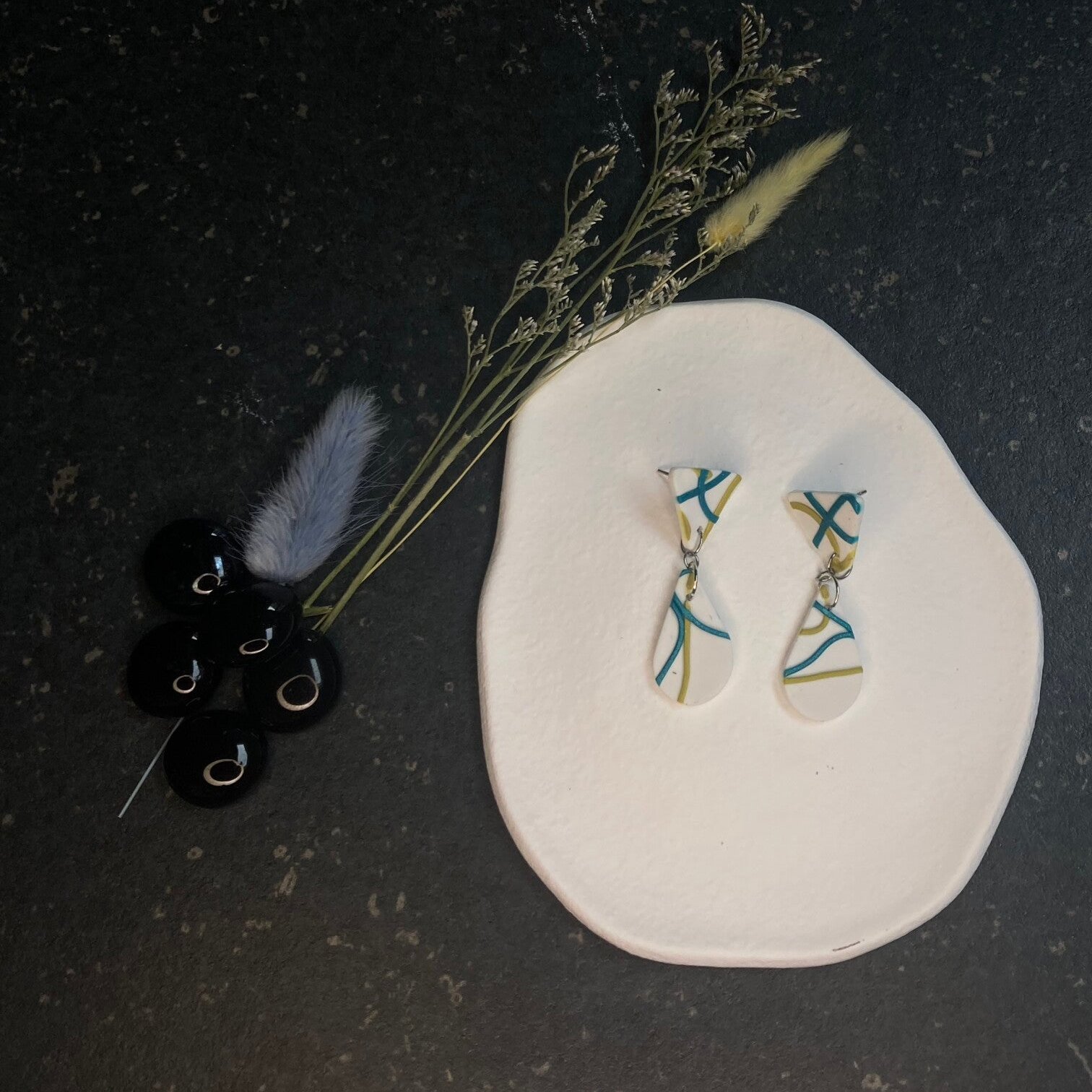 Deze traangewijze witte oorbellen zijn een prachtige mix van verfijning en creativiteit. De olijfgroene en turquoise onregelmatige lijnen geven ze een speelse, organische uitstraling, terwijl het strakke witte ontwerp zorgt voor een frisse en lichte afwerking. Deze unieke oorbellen passen perfect bij zowel casual als chique outfits, en voegen een vleugje kleur en kunstzinnigheid toe aan je look. Handgemaakt met zorg, zijn ze de ideale keuze voor wie houdt van opvallende accessoires die tegelijkertijd elegant blijven.
