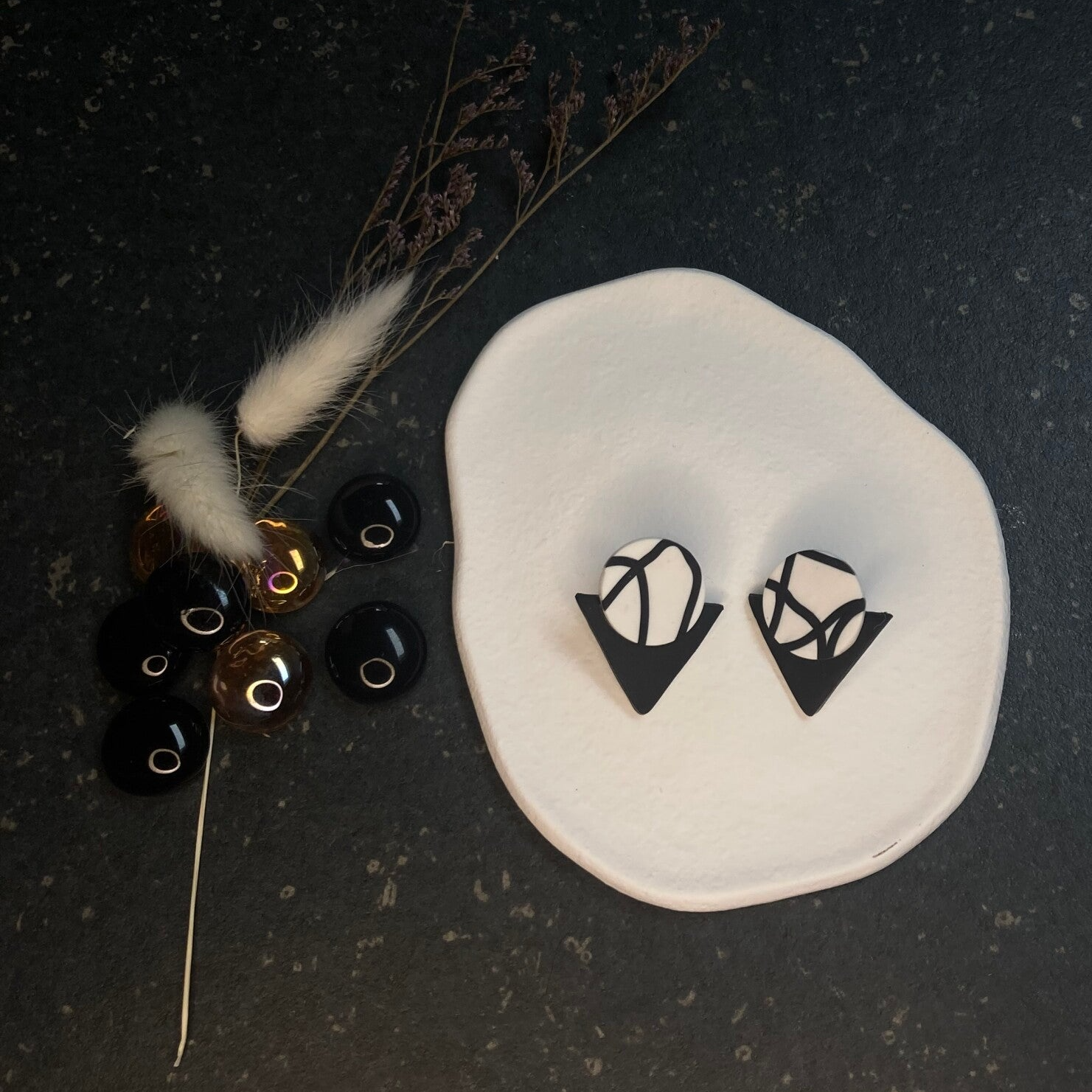 Deze zwarte driehoekige oorbellen met een witte ronde en zwarte lijnen zijn een stijlvolle mix van geometrie en subtiliteit. Het gedurfde zwart van de driehoek creëert een krachtig contrast met de zachte witte ronde, die door de strakke zwarte lijnen een verfijnde en moderne uitstraling krijgt. Dit minimalistische ontwerp is perfect voor wie houdt van eigentijdse, unieke accessoires die toch tijdloos zijn. Of je nu een casual look hebt of iets eleganters zoekt, deze oorbellen passen bij elke gelegenheid en voegen een vleugje kunstzinnigheid toe aan je stijl.