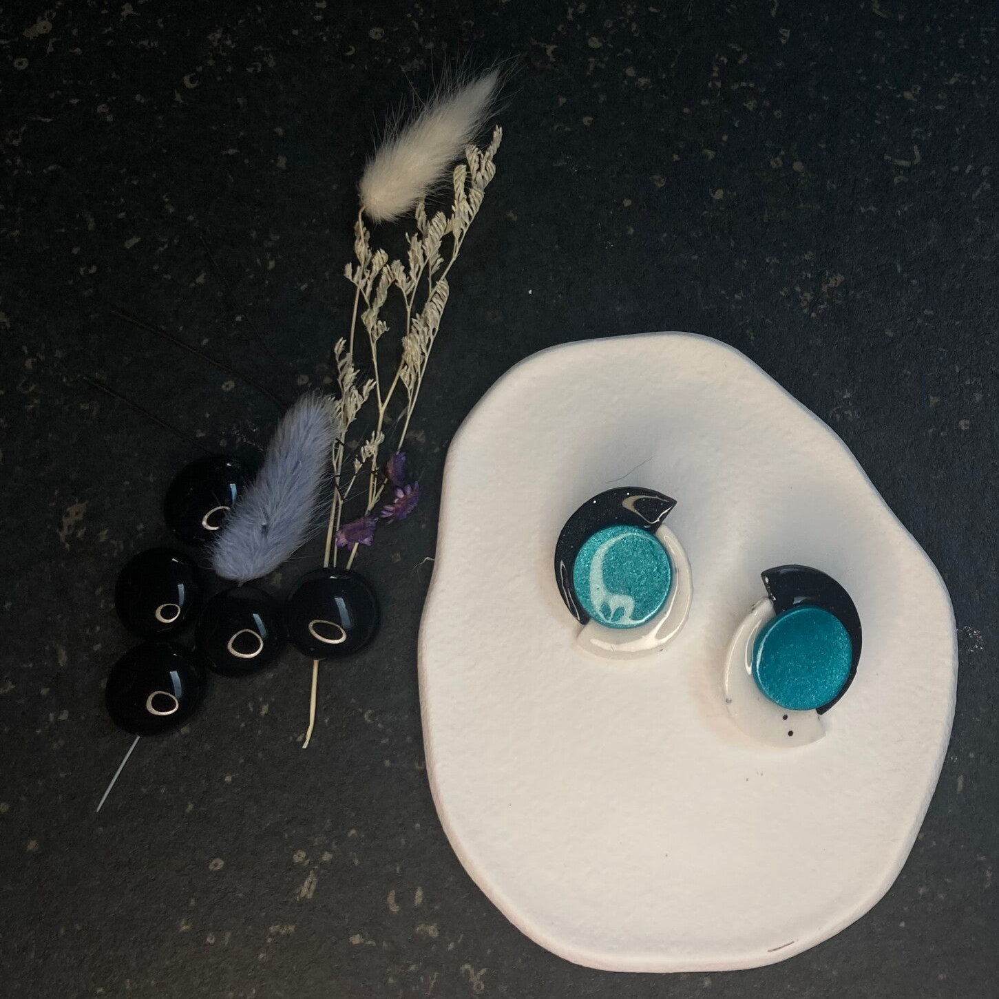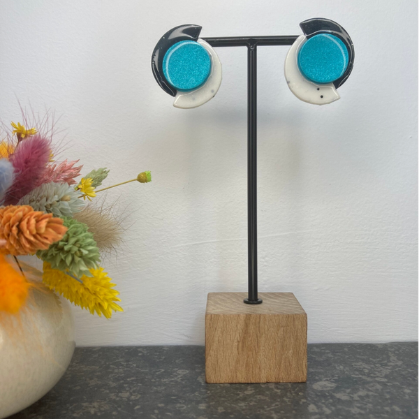 Deze oorbellen bestaan uit twee halve cirkels in zwart en gespikkeld wit, prachtig verbonden door een levendige turquoise cirkel. Het contrast tussen de donkere tinten en de felle turquoise zorgt voor een speelse, maar verfijnde uitstraling. Het moderne ontwerp met de drie verschillende elementen creëert een unieke, dynamische look die je outfit meteen een artistieke flair geeft. Deze handgemaakte oorbellen zijn perfect voor wie houdt van een eigentijdse stijl met een vleugje kleur en creativiteit. Voeg deze opvallende oorbellen toe aan je collectie voor een verfrissende upgrade!