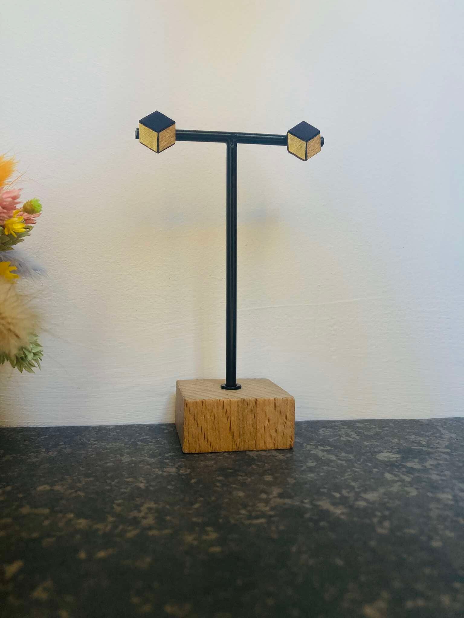 Deze vijfhoekige houten oorbellen zijn een prachtige combinatie van kunst en stijl, met een verbluffende optische illusie gecreëerd door de zwarte en gouden details. Het geometrische ontwerp wordt versterkt door de speelse wisseling van kleuren, die zorgen voor een dynamisch effect en de oorbellen extra diepte geven. De zwarte en gouden accenten voegen een luxe uitstraling toe, terwijl het houten materiaal zorgt voor een warme, organische basis. Perfect voor wie houdt van gedurfde, unieke accessoires die zowel kunstzinnig als elegant zijn. Deze handgemaakte oorbellen brengen zeker een creatief en opvallend element in je look!