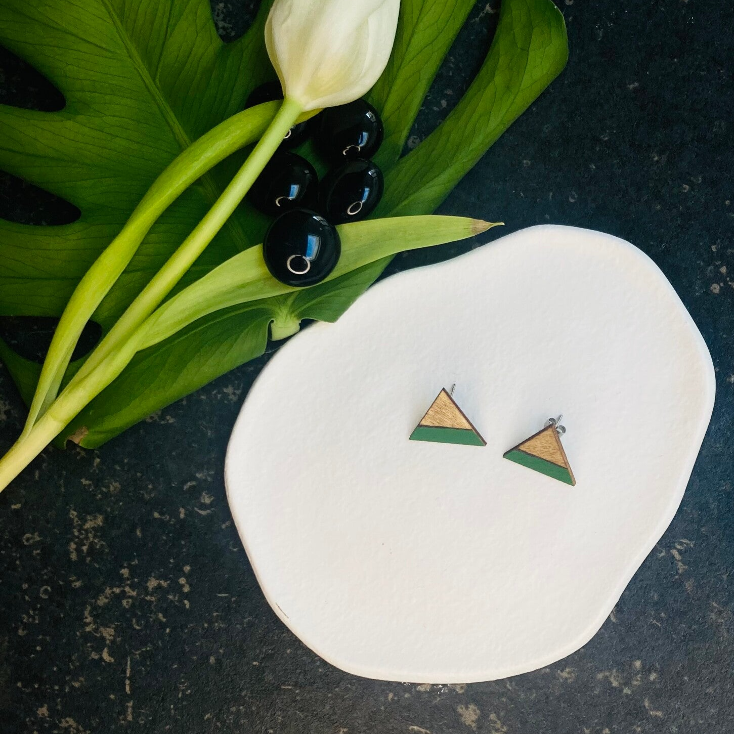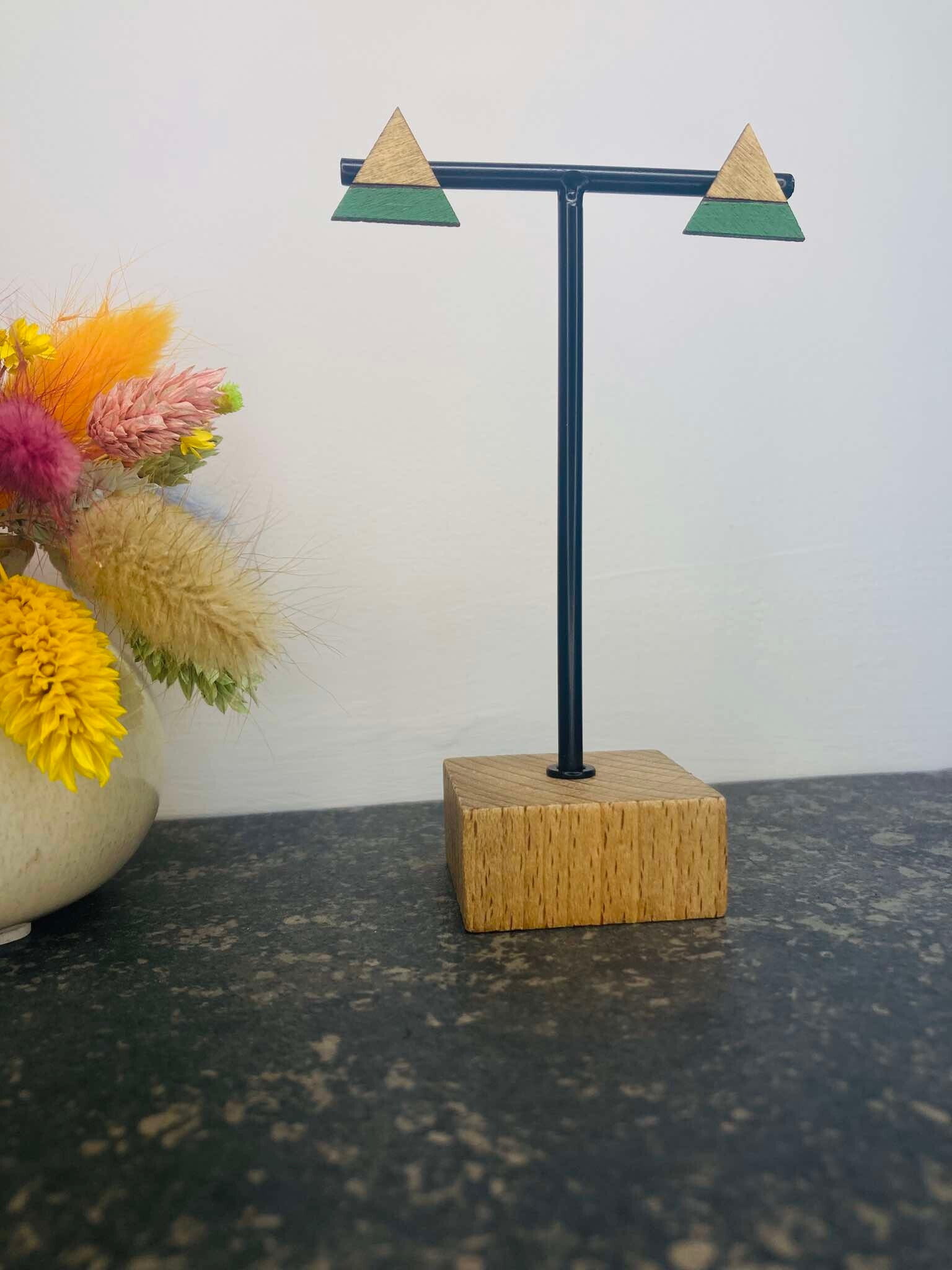 Deze houten driehoekige oorbellen met een lichtgroene lijn zijn een prachtige mix van natuurlijke warmte en subtiele kleur. Het strakke driehoekige ontwerp krijgt een verfijnde uitstraling door de frisse lichtgroene lijn, die een speelse, doch elegante flair toevoegt. Het hout zorgt voor een organische basis, terwijl het groene detail een kalme en moderne toets geeft. Handgemaakt met zorg, zijn deze oorbellen de perfecte keuze voor wie houdt van minimalistische, maar toch unieke accessoires die je look een verfrissende upgrade geven.