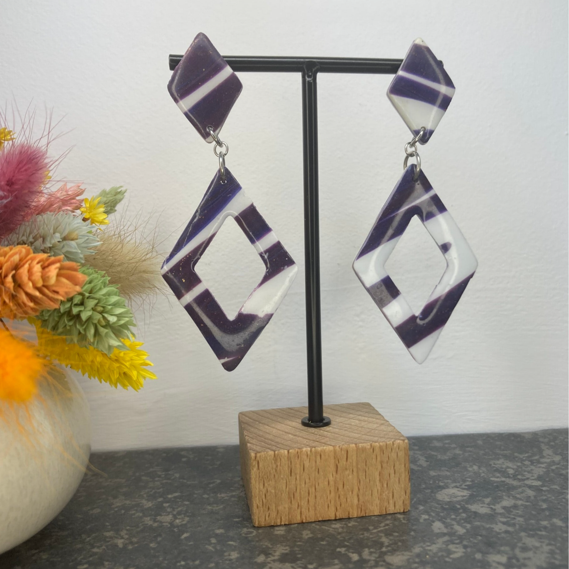 Laat je stijl stralen met deze exclusieve ruitvormige oorbellen in een betoverende combinatie van puur wit en diep paars. De geometrische vorm geeft een moderne, verfijnde uitstraling, terwijl de kleuren een mysterieuze en luxueuze touch toevoegen.