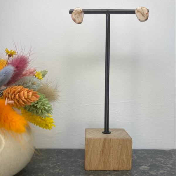 Deze lichtkleurige oorbellen stralen een subtiele, maar verfijnde stijl uit. Het minimalistische ontwerp en de zachte tinten maken ze een tijdloos accessoire, perfect om je look een elegante en rustige uitstraling te geven.
