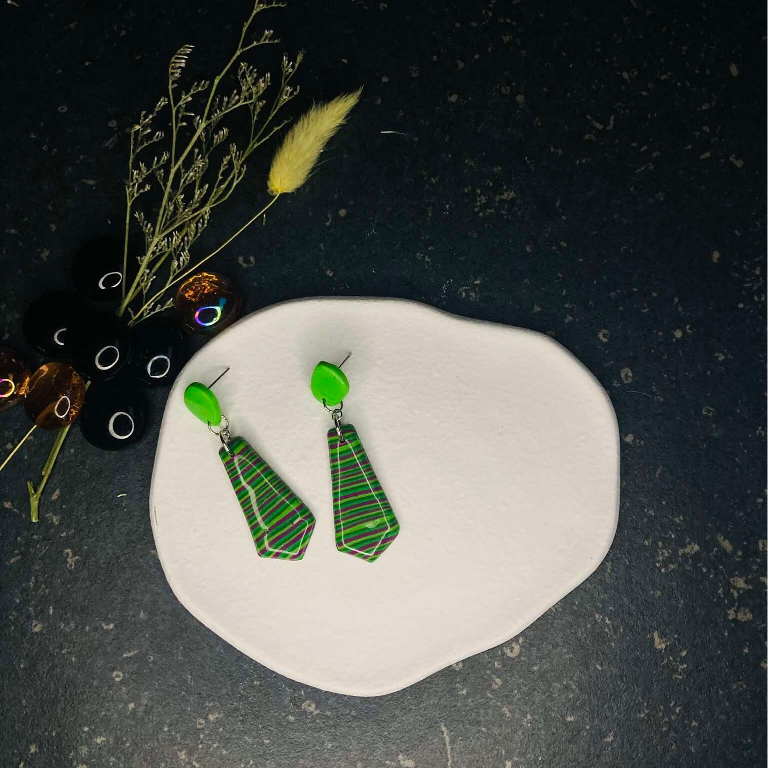 Deze lange oorbellen met verschillende tinten groen en roze in steeltjes zorgen voor een speelse en verfijnde uitstraling. De subtiele kleurovergangen creëren een dynamisch effect, terwijl de elegante lengte de oorbellen tot een opvallend accessoire maakt voor elke gelegenheid.