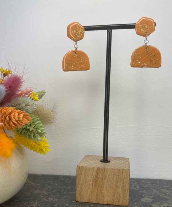 Deze oorbellen in een unieke vorm combineren levendig oranje met gouden glinsters voor een gedurfde en verfijnde uitstraling. Het speelse kleurcontrast en de subtiele glans maken ze tot een opvallend accessoire dat je look een energieke en luxe twist geeft.
