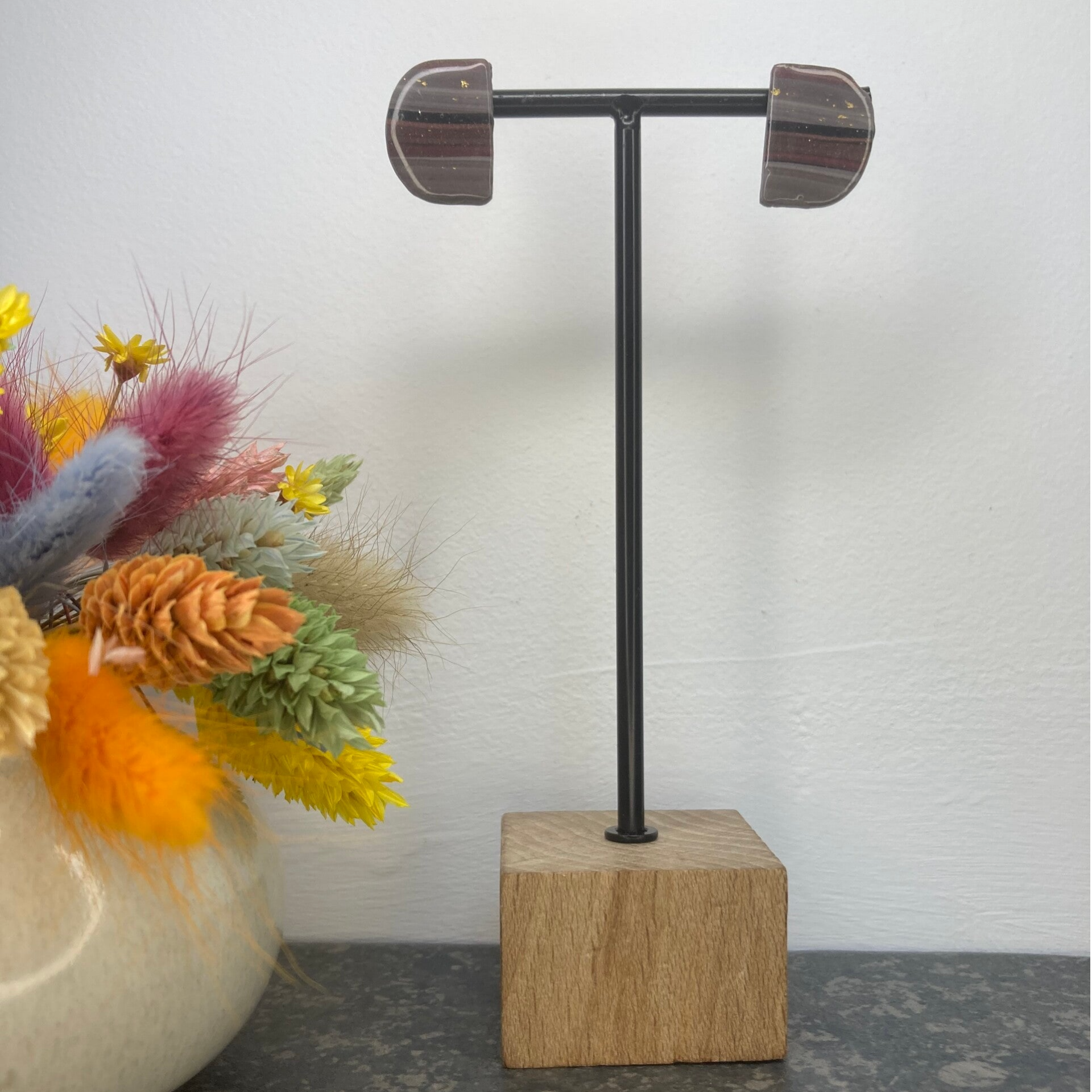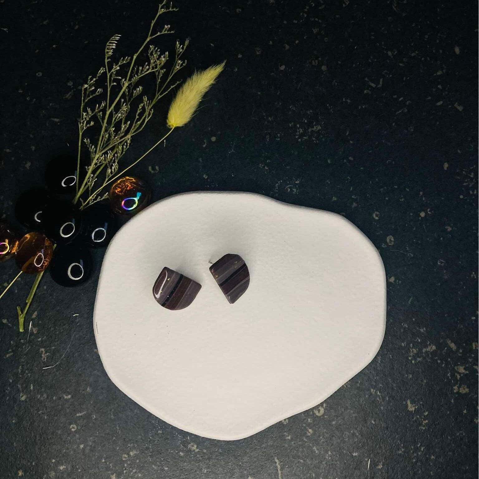 Deze oorbellen in aardse tinten met bruin stralen een natuurlijke en warme uitstraling uit. De zachte bruintinten, gecombineerd met subtiele aardse kleurnuances, creëren een rustige en verfijnde look die perfect past bij elke gelegenheid. Een ideale keuze voor een tijdloze en organische stijl.
